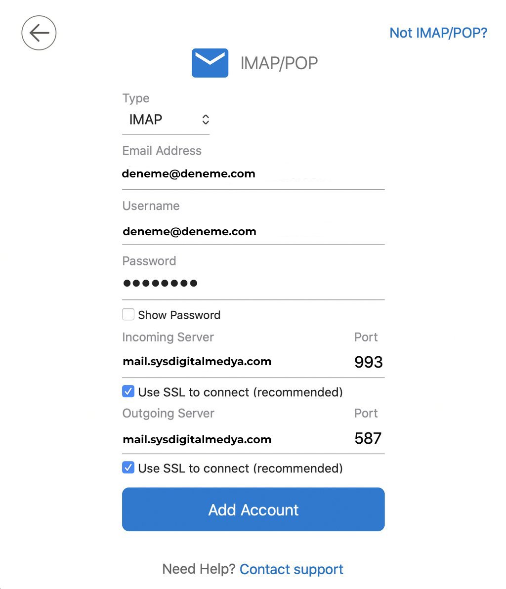 IMAP’ı ya da POP’u seçin ve aşağıdaki örnekteki gibi bilgileri doldurun. Daha sonra ise devam etmek için Add Account‘a (Hesap Ekle) tıklayın. Eğer hangisini tercih edeceğinizi bilmiyorsanız POP ve IMAP konulu bu rehbere göz atın.