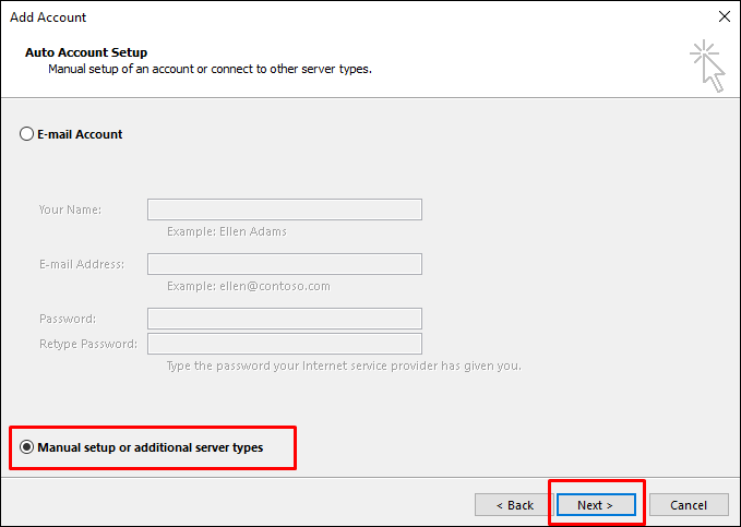 Daha sonra ise “Manual setup or additional server types (Sunucu ayarlarını veya ek sunucu türlerini el ile yapılandır)” seçeneğini kullanın, e-posta adresinizle şifrenizi girin ve sıradaki pencereye geçin.